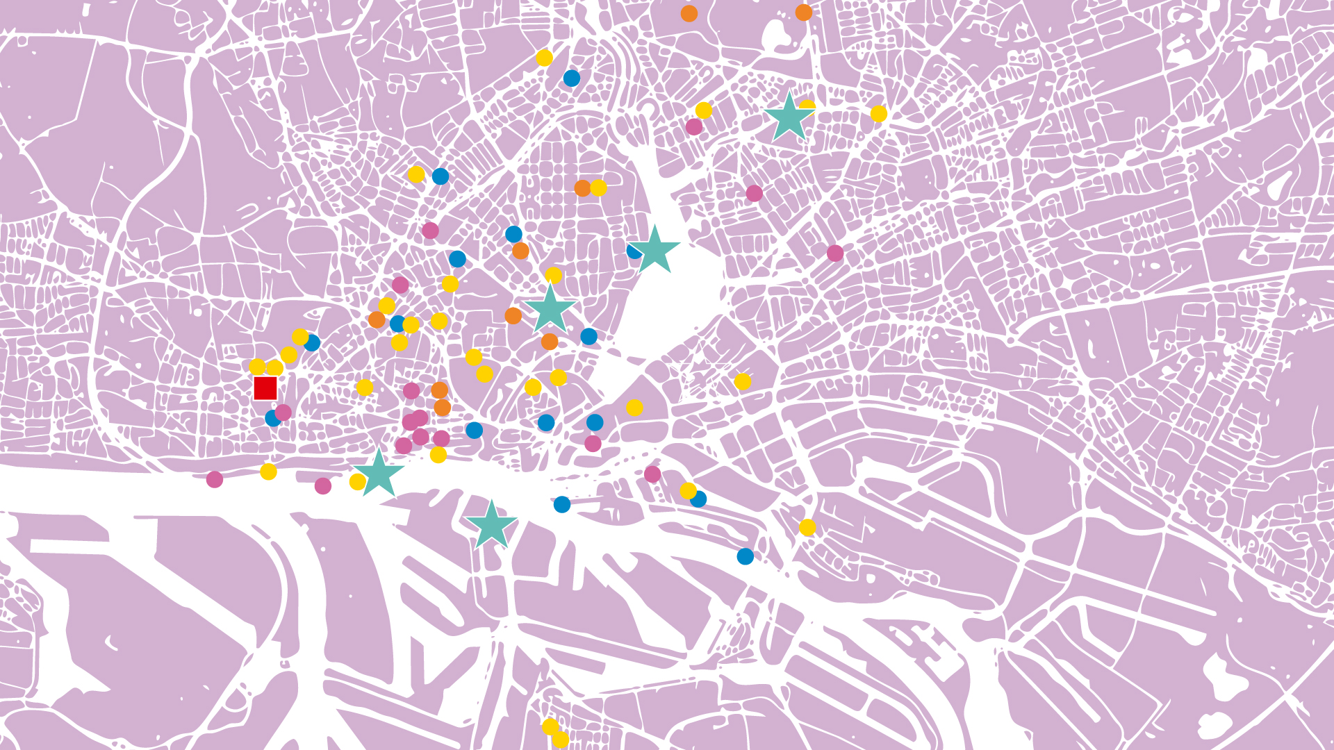 blue: Birdland, Halle 424, Nica Jazz Club, JazzHall, Elbphilharmonie, Cotton Club, Bar Italia, Alte Druckerei, Nancy Tilitz Galery, Brückenstern, MS Stubnitz, White Cube,